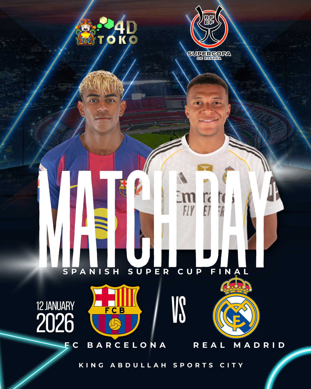 TOKO4D – Pertandingan Barcelona vs Real Madrid pada babak final Piala Super Spanyol 2026 akan digelar di King Abdullah Sports City, Jeddah, Arab Saudi. El Clasico di ajang Supercopa de Espana ini dijadwalkan kick-off Senin, 12 Januari 2026, jam 02.00 WIB.