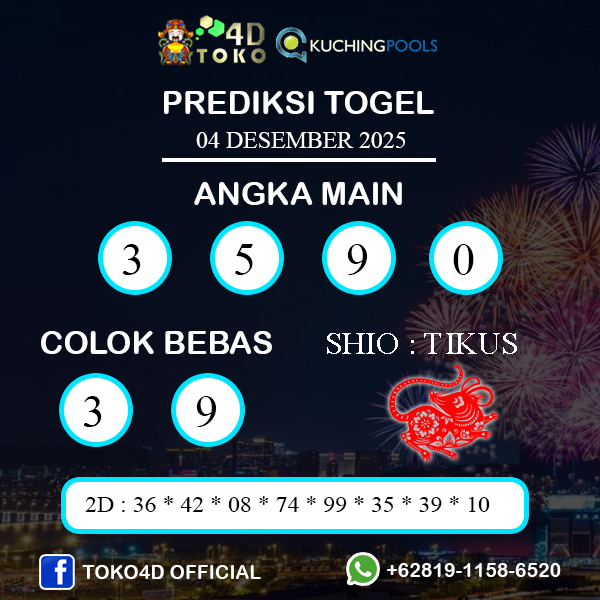 TOKO4D – PREDIKSI TOGEL KUCHING KAMIS : 04 DESEMBER 2025, Adalah prediksi jitu dan akurat terpercaya online yang akan result setiap hari jam 15:30 WIB.