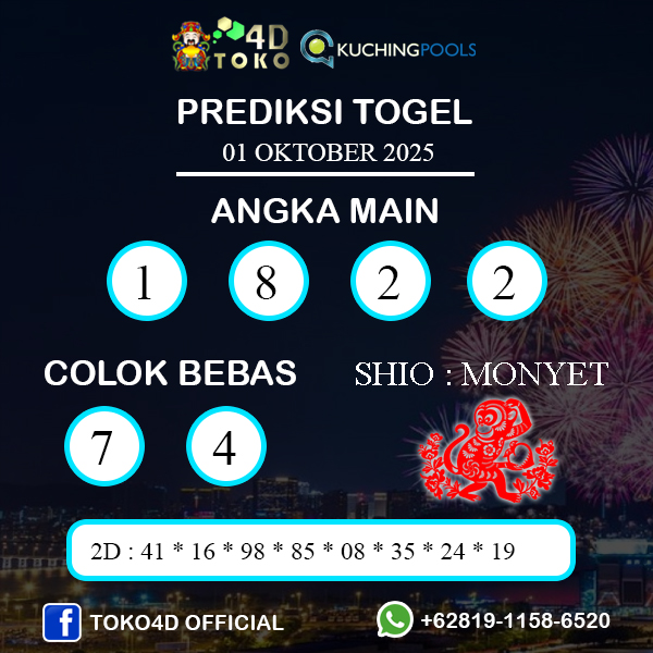 TOKO4D – PREDIKSI TOGEL KUCHING RABU : 01 OKTOBER 2025, Adalah prediksi jitu dan akurat terpercaya online yang akan result setiap hari jam 15:30 WIB.