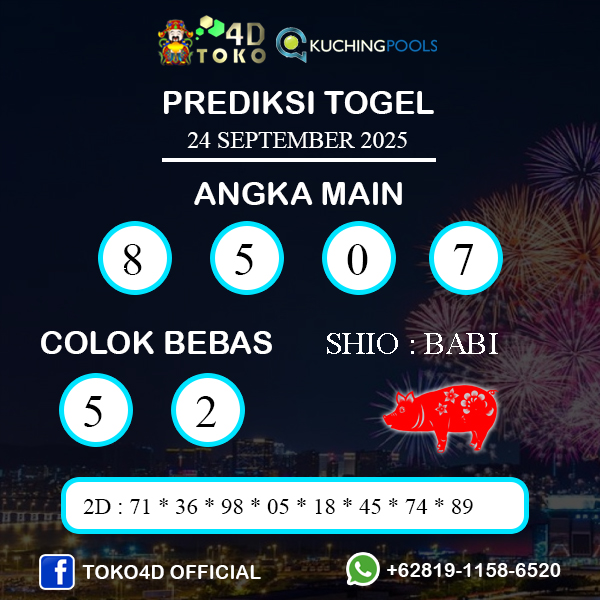 TOKO4D – PREDIKSI TOGEL KUCHING RABU : 24 SEPTEMBER 2025, Adalah prediksi jitu dan akurat terpercaya online yang akan result setiap hari jam 15:30 WIB.