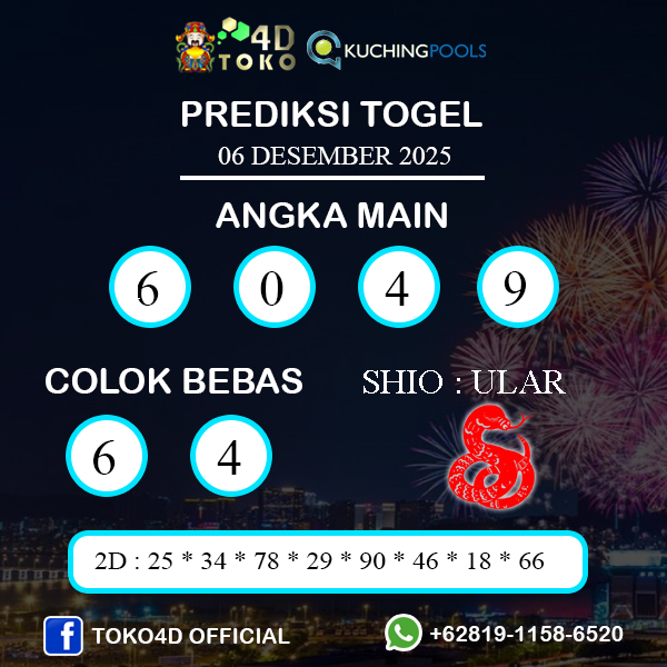 TOKO4D – PREDIKSI TOGEL KUCHING SABTU : 06 DESEMBER 2025, Adalah prediksi jitu dan akurat terpercaya online yang akan result setiap hari jam 15:30 WIB.
