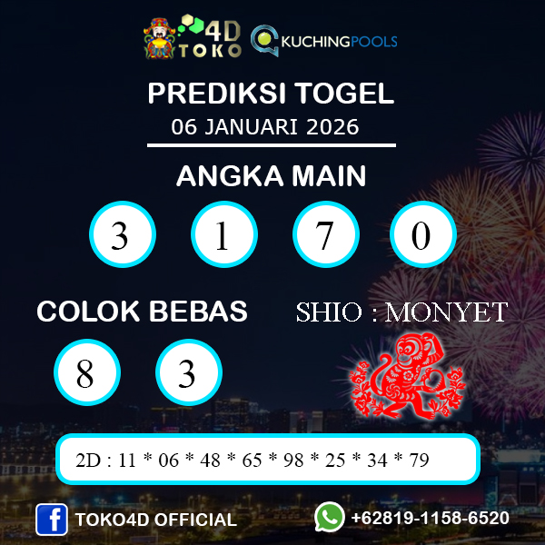 TOKO4D – PREDIKSI TOGEL KUCHING SELASA : 06 JANUARI 2026, Adalah prediksi jitu dan akurat terpercaya online yang akan result setiap hari jam 15:30 WIB.