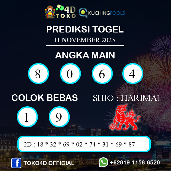 TOKO4D – PREDIKSI TOGEL KUCHING SELASA : 11 NOVEMBER 2025, Adalah prediksi jitu dan akurat terpercaya online yang akan result setiap hari jam 15:30 WIB.
