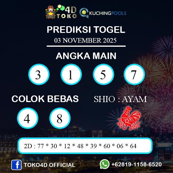 TOKO4D – PREDIKSI TOGEL KUCHING SENIN : 03 NOVEMBER 2025, Adalah prediksi jitu dan akurat terpercaya online yang akan result setiap hari jam 15:30 WIB.