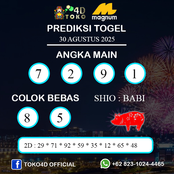 Demikian PREDIKSI TOGEL MAGNUM RABU : 27 AGUSTUS 2025, dari kami, Jadikan Bocoran Keluaran Togel di atas sebagai prediksi jitu kami. Silahkan Racik Gabung dan Kombinasikan Angka diatas untuk mendapatkan Hasil yang maksimal di 4d, 3d, 2d. Akhir kata kamu ucapkan terima kasih sudah mampir di forum prediksi togel akurat dan jitu ini. Selalu ikuti terus prediksi togel terupdate setiap harinya hanya di TOKO4D, semoga keberuntungan selalu menyertai anda. Jangan lupa untuk like, share dan komentar untuk lebih lengkapnya
