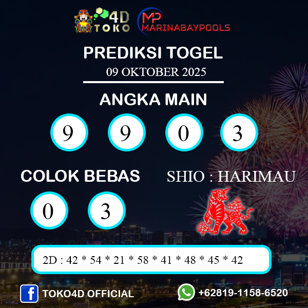 TOKO4D – PREDIKSI TOGEL MARINABAY KAMIS : 09 OKTOBER 2025, Adalah prediksi jitu dan akurat terpercaya online yang akan result setiap hari jam 15:00 WIB.
