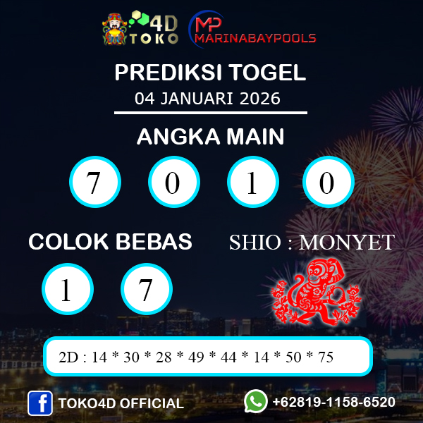 TOKO4D – PREDIKSI TOGEL MARINABAY MINGGU : 04 JANUARI 2026, Adalah prediksi jitu dan akurat terpercaya online yang akan result setiap hari jam 15:00 WIB.