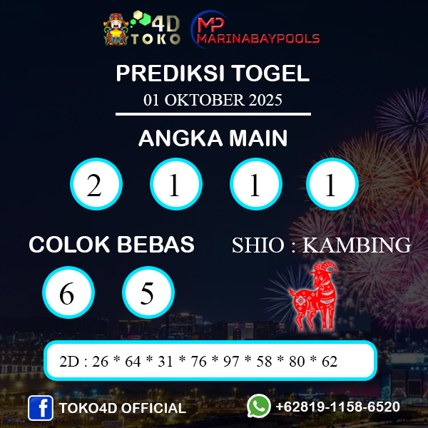 TOKO4D – PREDIKSI TOGEL MARINABAY RABU : 01 OKTOBER 2025, Adalah prediksi jitu dan akurat terpercaya online yang akan result setiap hari jam 15:00 WIB.