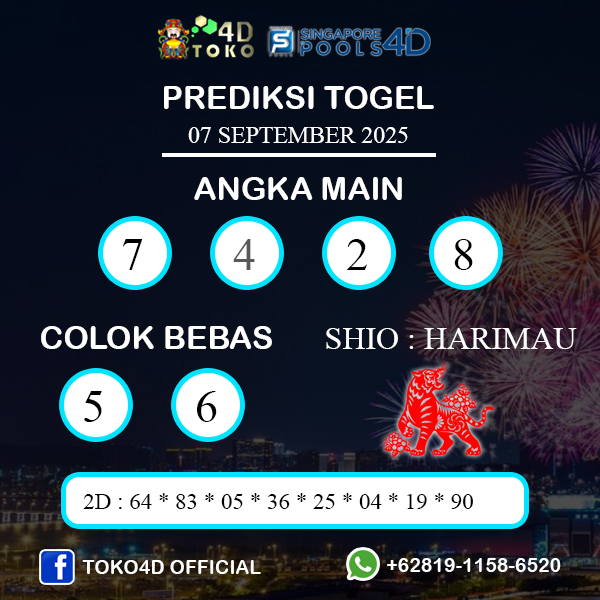 TOKO4D – PREDIKSI TOGEL SINGAPORE MINGGU : 07 SEPTEMBER 2025 Adalah Prediksi togel yang akan keluar nanti sore pada jam 17.45 23 dan untuk jam di SINGAPORE 18.45 PM, Sebagai tambahan kami mengingatkan kembali bahwa Togel SINGAPORE Libur di hari selasa dan jumat.