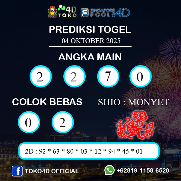 TOKO4D – PREDIKSI TOGEL SINGAPORE SABTU : 04 OKTOBER 2025 Adalah Prediksi togel yang akan keluar nanti sore pada jam 17.45 23 dan untuk jam di SINGAPORE 18.45 PM, Sebagai tambahan kami mengingatkan kembali bahwa Togel SINGAPORE Libur di hari selasa dan jumat.