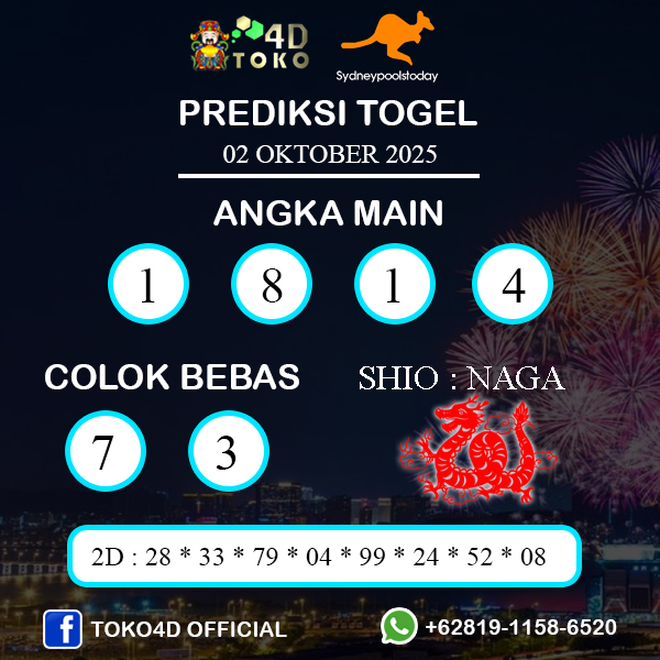 TOKO4D – PREDIKSI TOGEL SYDNEY KAMIS : 02 OKTOBER 2025, Adalah prediksi Jitu dan akurat terpercaya online yang akan result setiap hari jam 14.00 WIB.