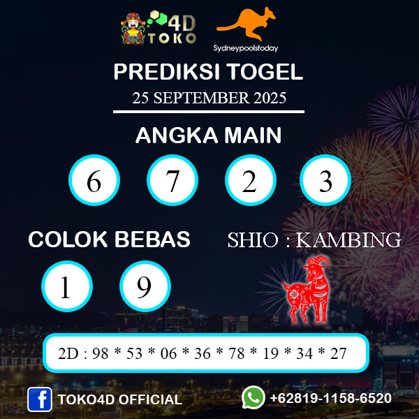 TOKO4D – PREDIKSI TOGEL SYDNEY KAMIS : 25 SEPTEMBER 2025, Adalah prediksi Jitu dan akurat terpercaya online yang akan result setiap hari jam 14.00 WIB.