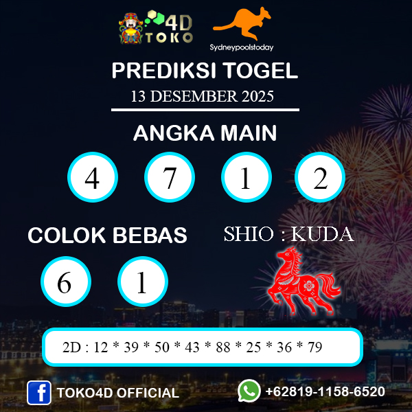 TOKO4D – PREDIKSI TOGEL SYDNEY SABTU : 13 DESEMBER 2025, Adalah prediksi Jitu dan akurat terpercaya online yang akan result setiap hari jam 14.00 WIB.