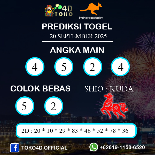 TOKO4D – PREDIKSI TOGEL SYDNEY SABTU : 20 SEPTEMBER 2025, Adalah prediksi Jitu dan akurat terpercaya online yang akan result setiap hari jam 14.00 WIB.