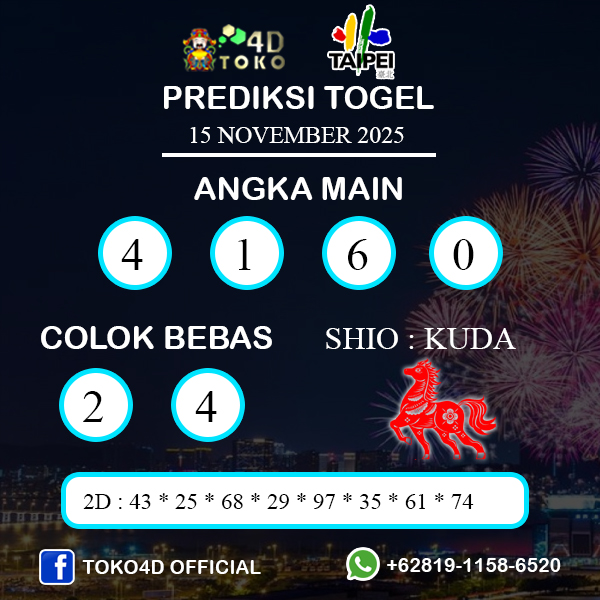 TOKO4D – PREDIKSI TOGEL TAIPEI SABTU : 15 NOVEMBER 2025, Adalah Prediksi jitu dan akurat terpercaya online yang akan result setiap hari jam 23:00 WIB
