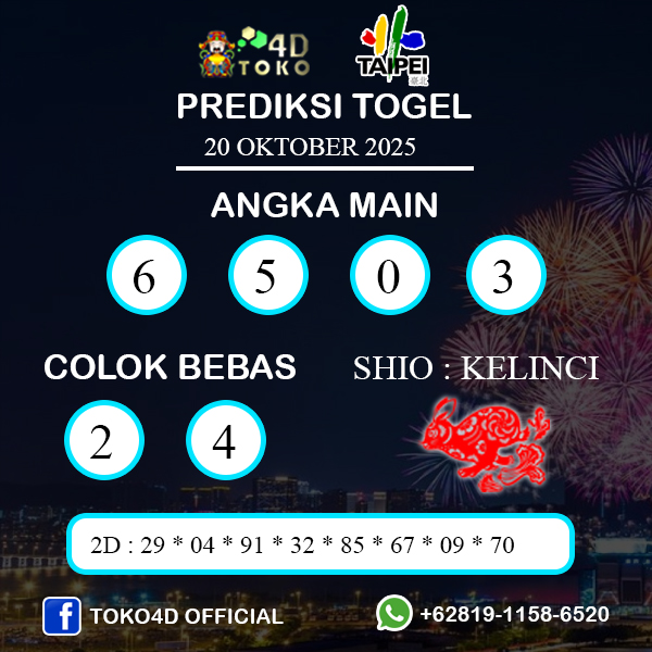 TOKO4D – PREDIKSI TOGEL TAIPEI SENIN : 20 OKTOBER 2025, Adalah Prediksi jitu dan akurat terpercaya online yang akan result setiap hari jam 23:00 WIB