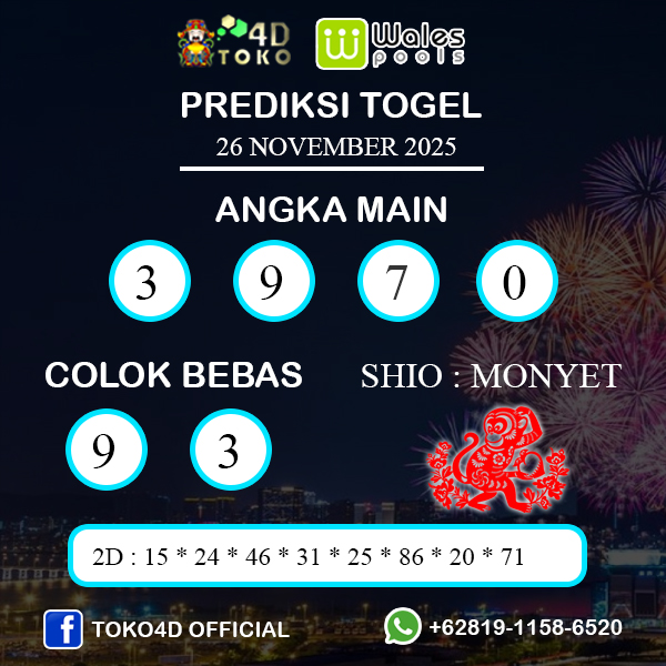 TOKO4D – PREDIKSI TOGEL WALES RABU : 26 NOVEMBER 2025, Adalah prediksi jitu dan akurat terpercaya online yang akan result setiap hari jam 19:30 WIB